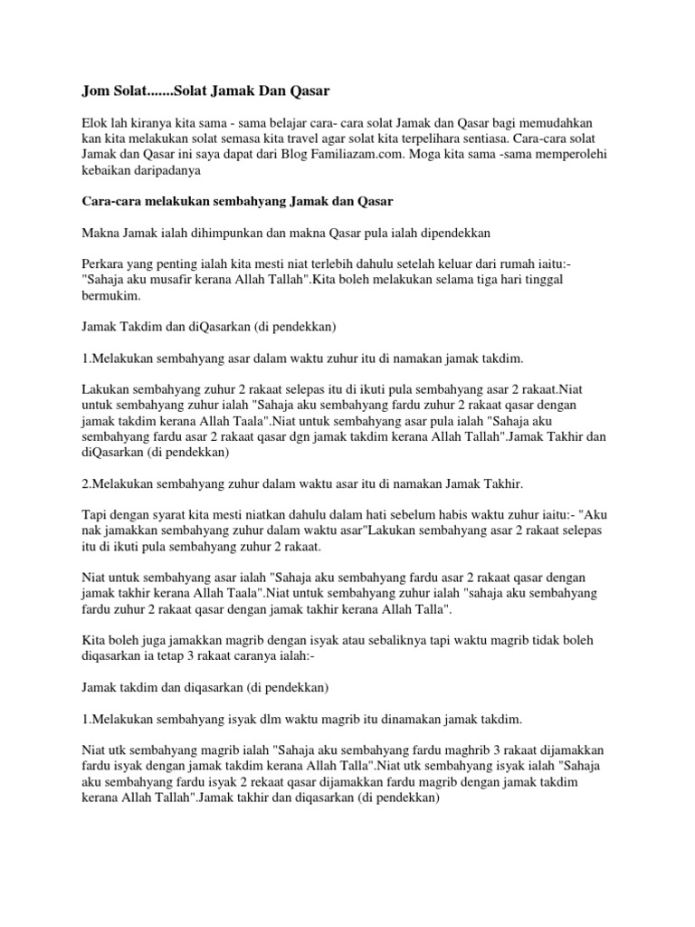 Niat solat jamak takdim dan qasar hafal fadlim travel. Lafaz niat shalat jama k qashar ponpes darul ulum al. Niat sholat dzuhur jamak taqdim dengan sholat ashar. Solat jamak atau solat qasar diharuskan kepada sesiapa yang musafir lebih dari 2 marhalah (60 batu atau 90 kilometer). 1.melakukan sembahyang isyak dalam waktu magrib itu dinamakan jamak takdim.
