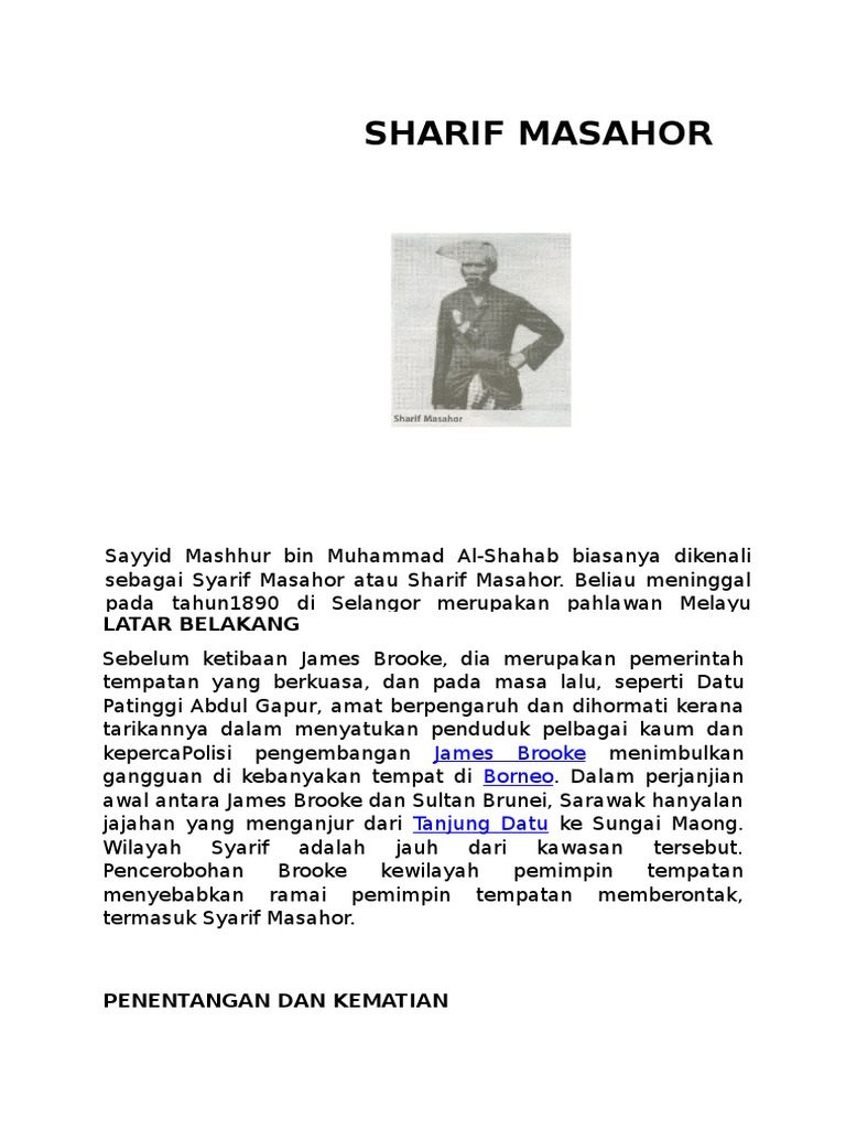 .masahor, or sharif masahor in malayan contexts,1 (died 1890 in selangor) was a famous malay warrior of hadhrami descent2 in sarikei, sarawak state masahor and his army wanted to approach kuching via the sarawak river. Sharif masahor sarawak hero подробнее. 1 7.4 sharif masahor wira sarawak. De la wikipedia, enciclopedia liberă. În plus, majoritatea malaezilor în ceea ce era sarawak la acea vreme (în prezent kuching ) nu au acordat sprijin lui syarif masahor și luptătorilor săi de rezistență din cauza loialității lor față de james brooke , întrucât brooke era.