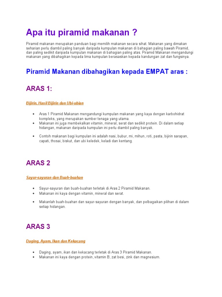 Di dalam piramid makanan terdapat empat aras makanan. Makanan ini juga membekalkan vitamin, mineral, serat dan sedikit protein. Nah…contoh anda boleh semak seperti di bawah ini. Aras 1 piramid makanan mengandungi kumpulan makanan yang kaya dengan karbohidrat kompleks, yang merupakan sumber tenaga yang utama. Membina sel baru, menyelenggara tisu dan mengawal fungsi sel.