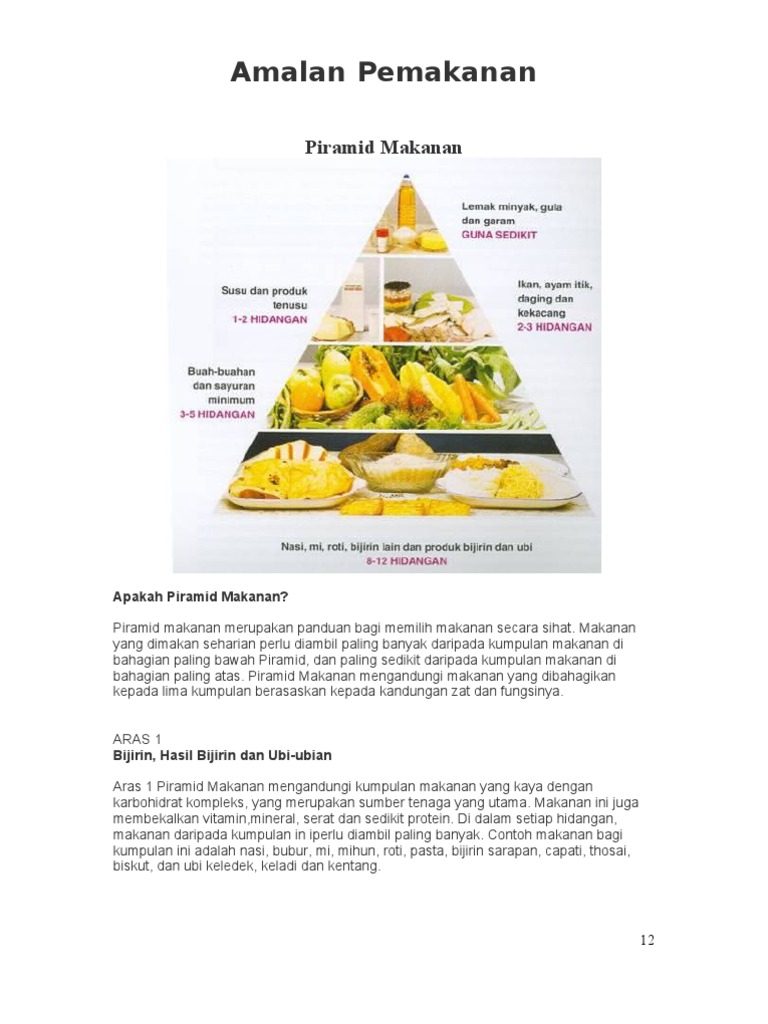 Piramid Makanan Bm T4 Docx Document from static.fdokumen.com Makanan di aras ini perlu diambil dalam kuantiti yang sedikit sahaja. Saiz setiap aras menentukan kadar jumlah peratus yang perlu diambil setiap hari bagi setiap kumpulan makanan tersebut. Selain daripada jenis kumpulan makanan, piramid makanan juga menyatakan jumlah sajian yang disarankan untuk diambil dalam sehari bagi setiap kumpulan makanan. • setiap aras mempunyai kumpulan makanan yang mengandungi kandungan zat dan fungsi yang tertentu. Pemakanan, piramid makanan, kepentingan pemakanan seimbang. Pengambilan berlebihan boleh meningkatkan risiko penyakit seperti sakit jantung, obesiti dan kencing. Nah…contoh anda boleh semak seperti di bawah ini. Piramid makanan merupakan panduan bagi memilih makanan secara sihat aras 3 susu dan tenusu kekacang ayam daging ikan fungsi protein membaiki tisu badan membina sel baru untuk pertumbuhan piramid makanan merupakan panduan bagi memilih makanan secara sihat.